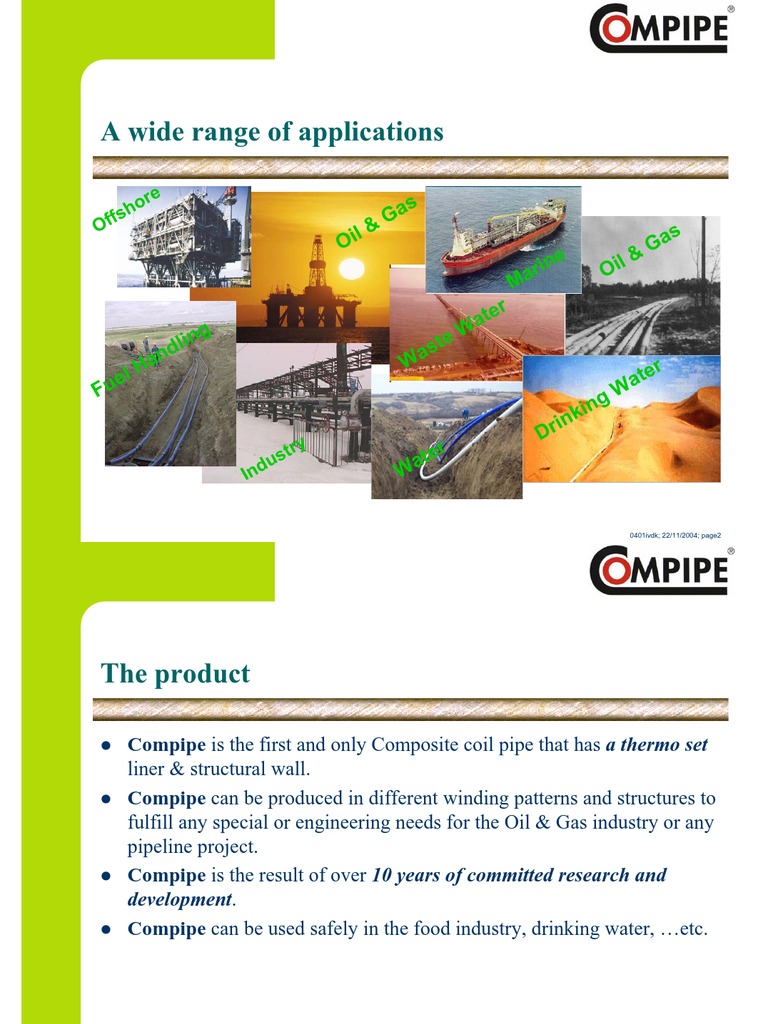 Compipe SL Single Laminate pipe, also known as full composite pipe: 1,5 mm thick inner liner/barrier, non-spoolable (plain end); Civil and chemical applications, low pressure; Working Pressure up to 55 bar (800 psi); Pipe length 1.0 - 20.0 meters; Standard length 11.8 meters. Compipe DL Dual Laminate pipe: 3.0 5.0 mm thick inner liner/barrier, plain end; Water, oil and gas applications, low to high pressure; Working pressure up to 275 bar (4,000 psi); Pipe length 1 - 20 meters; Standard length 11.8 meters.