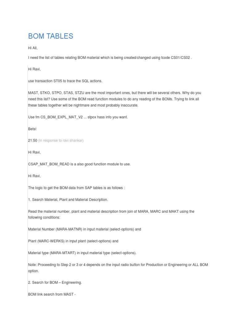 Hi All, I need the list of tables relating BOM material which is being created/changed using tcode CS01/CS02 . Hi Ravi, use transaction ST05 to trace the SQL actions. MAST, STKO, STPO, STAS, STZU are the most important ones, but there will be several others. Why do you need this list? Use some of the BOM read function modules to do any reading of the BOMs. Trying to link all these tables together will be nightmare and most probably inaccurate. Use fm CS_BOM_EXPL_MAT_V2 ... stpox hass info you want. Bets! 21:50 (in response to ravi shankar) Hi Ravi, CSAP_MAT_BOM_READ is a also good function module to use. Hi Ravi, The logic to get the BOM data from SAP tables is as follows : 1. Search Material, Plant and Material Description. Read the material number, plant and material description from join of MARA, MARC and MAKT using the following conditions: Material Number (MARA-MATNR) in input material (select-options) and Plant (MARC-WERKS) in input plant (select-options) and Material type (MARA-MTART) in input material type (select-options). Note: Proceeding to Step 2 or 3 or 4 depends on the input radio button for Production or Engineering or ALL BOM option. 2. Search for BOM Engineering. BOM link search from MAST -