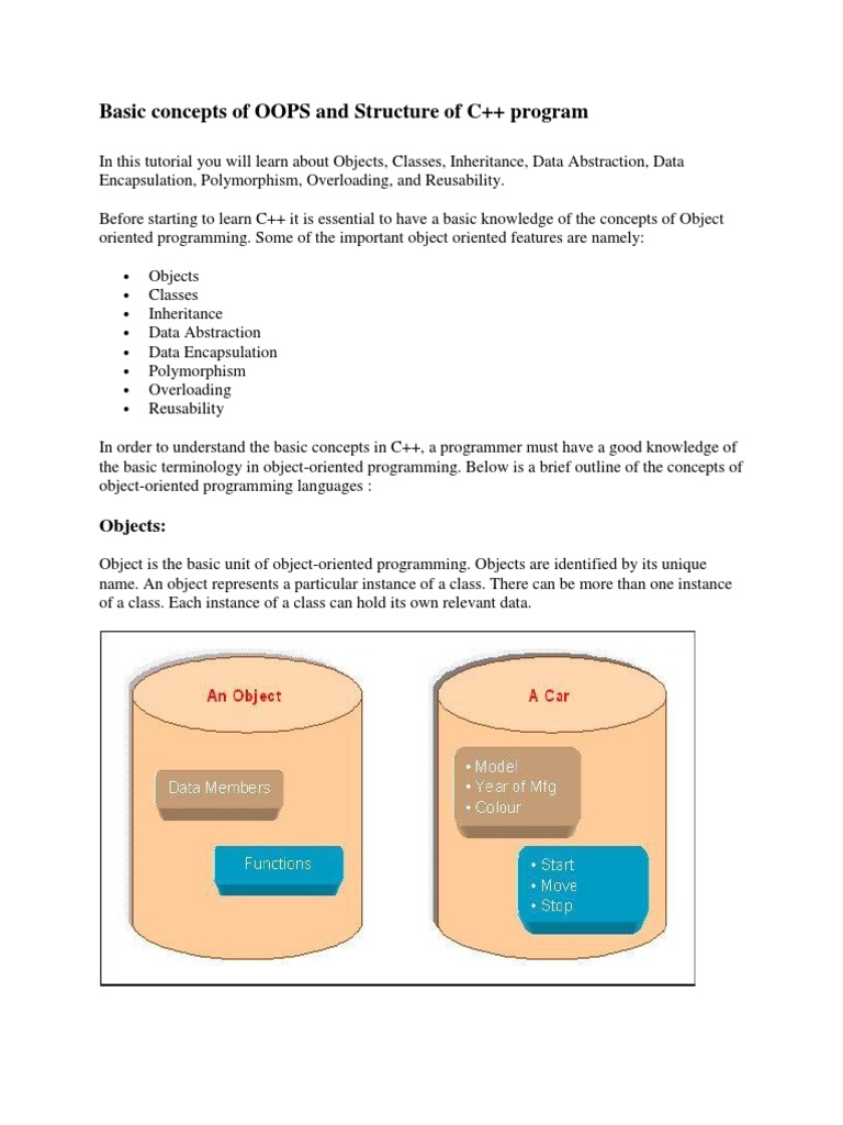 In this tutorial you will learn about Objects, Classes, Inheritance, Data Abstraction, Data Encapsulation, Polymorphism, Overloading, and Reusability. Before starting to learn C++ it is essential to have a basic knowledge of the concepts of Object oriented programming. Some of the important object oriented features are namely: