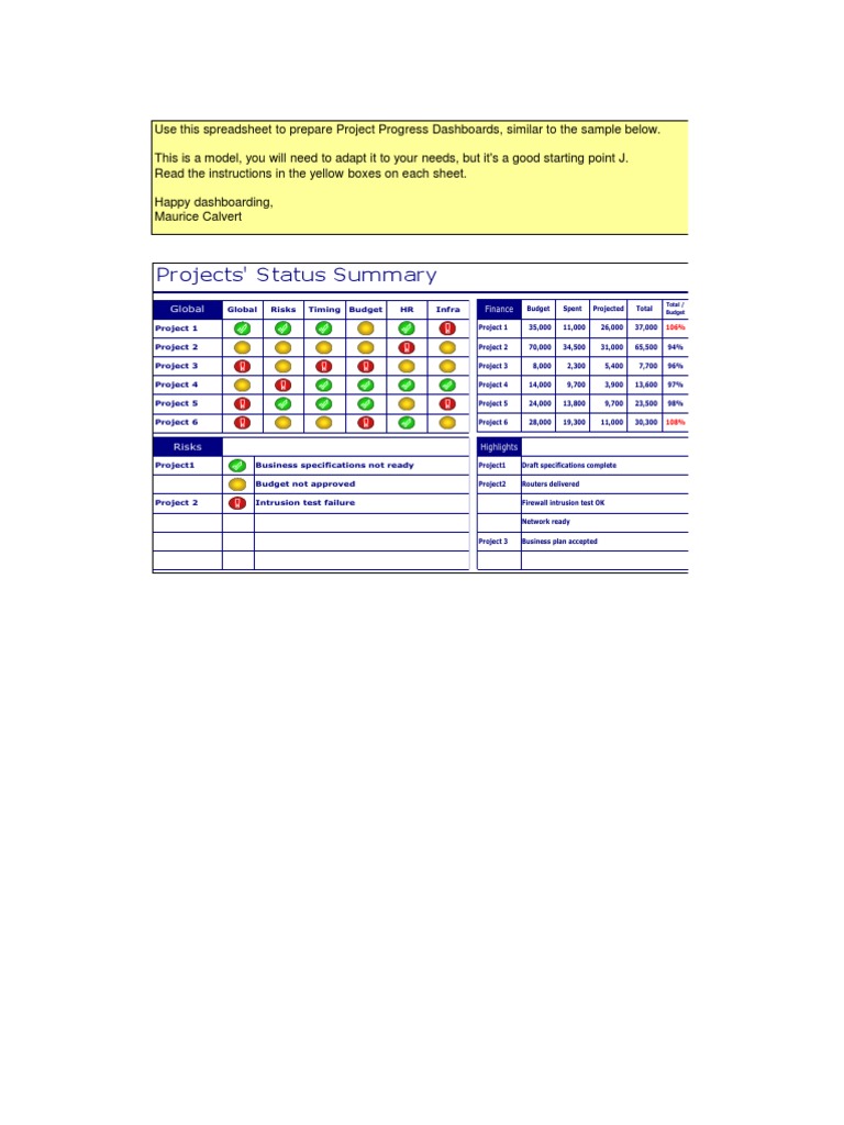 Use this spreadsheet to prepare Project Progress Dashboards, similar to the sample below.