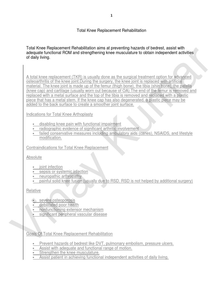 Total Knee Replacement Rehabilitation aims at preventing hazards of bedrest, assist with adequate functional ROM and strengthening knee musculature to obtain independent activities of daily living.