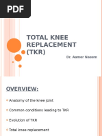 A total knee replacement (TKR) is usually done as the surgical treatment option for advanced osteoarthritis of the knee joint.During the surgery, the knee joint is replaced with artificial material. The knee joint is made up of the femur (thigh bone), the tibia (shin bone), the patella (knee cap) and cartilage (usually worn out because of OA).The end of the femur is removed and replaced with a metal surface and the top of the tibia is removed and replaced with a plastic piece that has a metal stem. If the knee cap has also degenerated, a plastic piece may be added to the back surface to create a smoother joint surface.