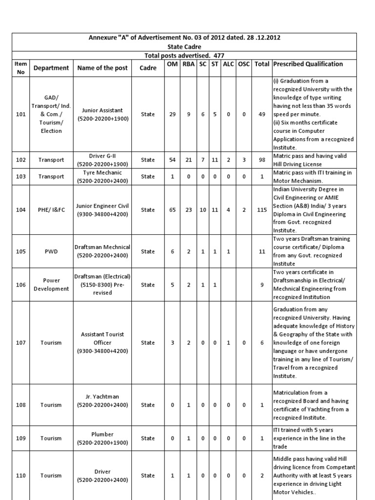 (i) Graduation from a recognized University with the knowledge of type writing having not less than 35 words 49 speed per minute. (ii) Six months certificate course in Computer Applications from a recognized Institute. Matric pass and having valid 98 Hill Driving License Matric pass with ITI training in 1 Motor Mechanism. Indian University Degree in Civil Engineering or AMIE Section (A&B) India/ 3 years 115 Diploma in Civil Engineering from Govt. recognized Institute. Two years Draftsman training course certificate/ Diploma 11 from any Govt. recognized Institute Two years certificate in Draftsmanship in Electrical/ 9 Mechnical Engineering from recognized Institution Graduation from any recognized University. Having adequate knowledge of History & Geography of the State with knowledge of one foreign language or have undergone training in any line of Tourism/ Travel from a recognized Institute. Matriculation from a recognized Board and having certificate of Yachting from a recognized Institute. ITI trained with 5 years experience in the line in the trade Middle pass having valid Hill driving licence from Competant Authority with at least 5 years experience in driving Light Motor Vehicles.. Matriculation from a recognized Board/ Institute and having ITI certificate in the trade of Electrician with 5 years experience in the field ITI trained in the trade