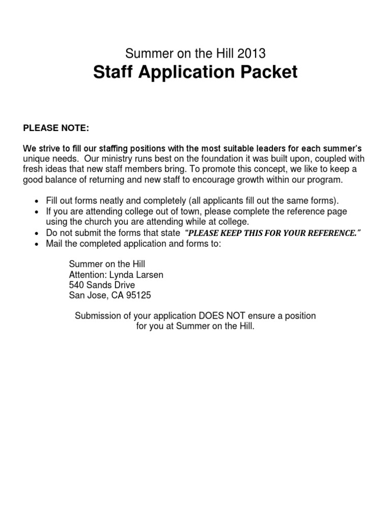 PLEASE NOTE: We strive to fill our staffing positions with the most suitable leaders for each summers unique needs. Our ministry runs best on the foundation it was built upon, coupled with fresh ideas that new staff members bring. To promote this concept, we like to keep a good balance of returning and new staff to encourage growth within our program. Fill out forms neatly and completely (all applicants fill out the same forms). If you are attending college out of town, please complete the reference page using the church you are attending while at college. Do not submit the forms that state PLEASE KEEP THIS FOR YOUR REFERENCE. Mail the completed application and forms to: Summer on the Hill Attention: Lynda Larsen 540 Sands Drive San Jose, CA 95125 Submission of your application DOES NOT ensure a position for you at Summer on the Hill.