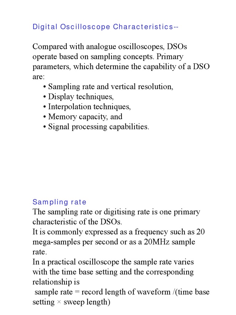 Compared with analogue oscilloscopes, DSOs operate based on sampling concepts concepts. Primary parameters, which determine the capability of a DSO are: Sampling rate and vertical resolution, Display techniques, Interpolation techniques, Memory capacity, and Signal processing capabilities capabilities.