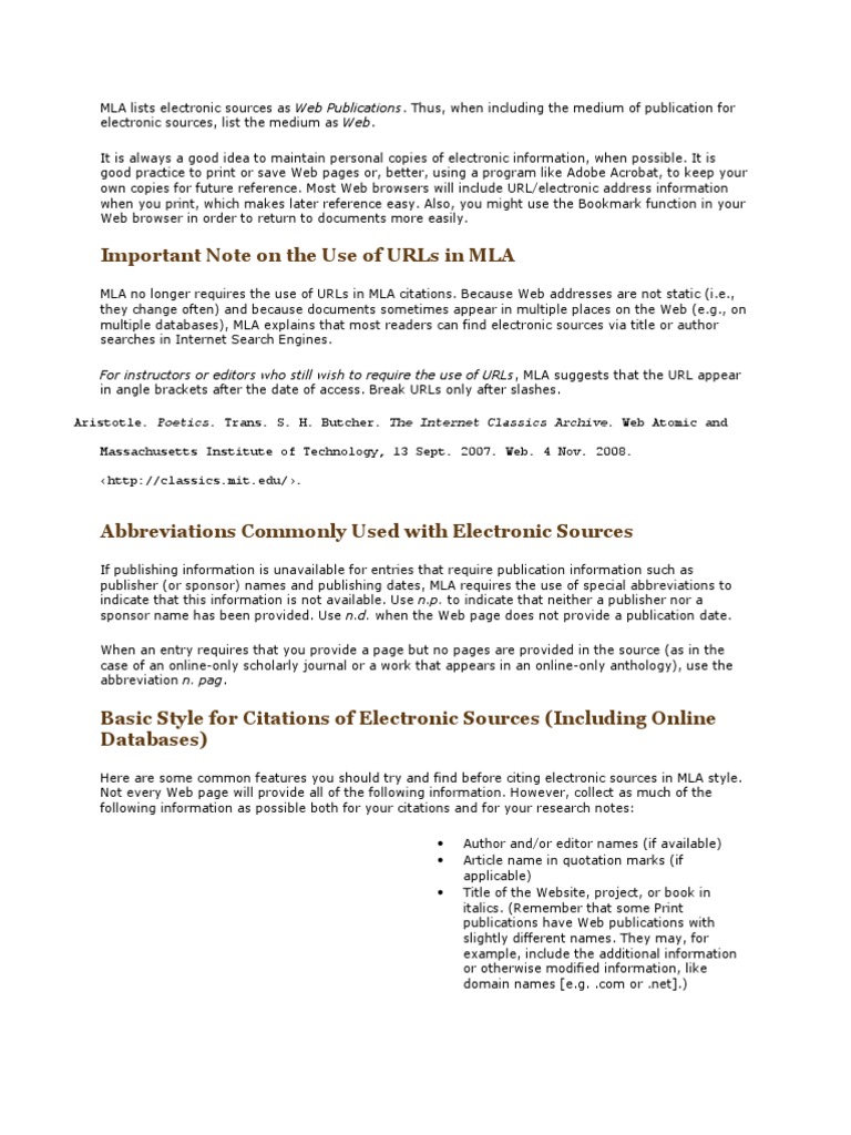 MLA no longer requires the use of URLs in MLA citations. Because Web addresses are not static (i.e., they change often) and because documents sometimes appear in multiple places on the Web (e.g., on multiple databases), MLA explains that most readers can find electronic sources via title or author searches in Internet Search Engines. For instructors or editors who still wish to require the use of URLs, MLA suggests that the URL appear in angle brackets after the date of access. Break URLs only after slashes. Aristotle. Poetics. Trans. S. H. Butcher. The Internet Classics Archive. Web Atomic and Massachusetts Institute of Technology, 13 Sept. 2007. Web. 4 Nov. 2008. http://classics.mit.edu/.
