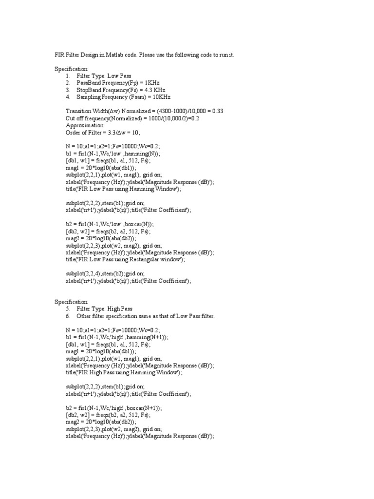 FIR Filter Design in Matlab code. Please use the following code to run it. Specification: 1.