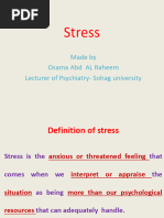 The body s initial response to threat or stress is to mobilize its stored resources. The sympathetic division of the autonomic nervous system diverts blood away from digestion and into the skeletal muscles, increases perspiration and prepares the body for a physical struggle. The endocrine glands pump epinephrine and other hormones into the blood stream that aid the actions of the autonomic nervous system and increase levels of blood sugar. When stress is intense or prolonged, theses bodily changes give rise to general muscle tension. stomach aches, headaches and other feelings of illness. The body s resources have now been fully mobilized and resistance to the stress is high. However, this resistance is costly in terms of resources and new stressors encountered ( physical and psychological) will strain already depleted resources and leave the person more vulnerable to physical stress ( disease). The individual s resources have been exhausted and resistance to the stress is lowered. In the case of prolonged exposure to severe physical stress ( illness) death can occur during this stage. Prolonged psychological stress can result in death if the person whose resources are depleted, becomes clinically depressed and suicidal.