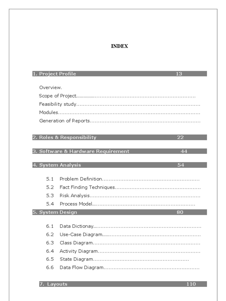 Scope of Project............................................................. 2. Feasibility study........................................................................... 3. Modules...................................................................................... 4. Generation of Reports................................................................... 2. Roles & Responsibility 3. Software & Hardware Requirement 4. System Analysis 5.1 5.2 5.3 5.4 22 44 54