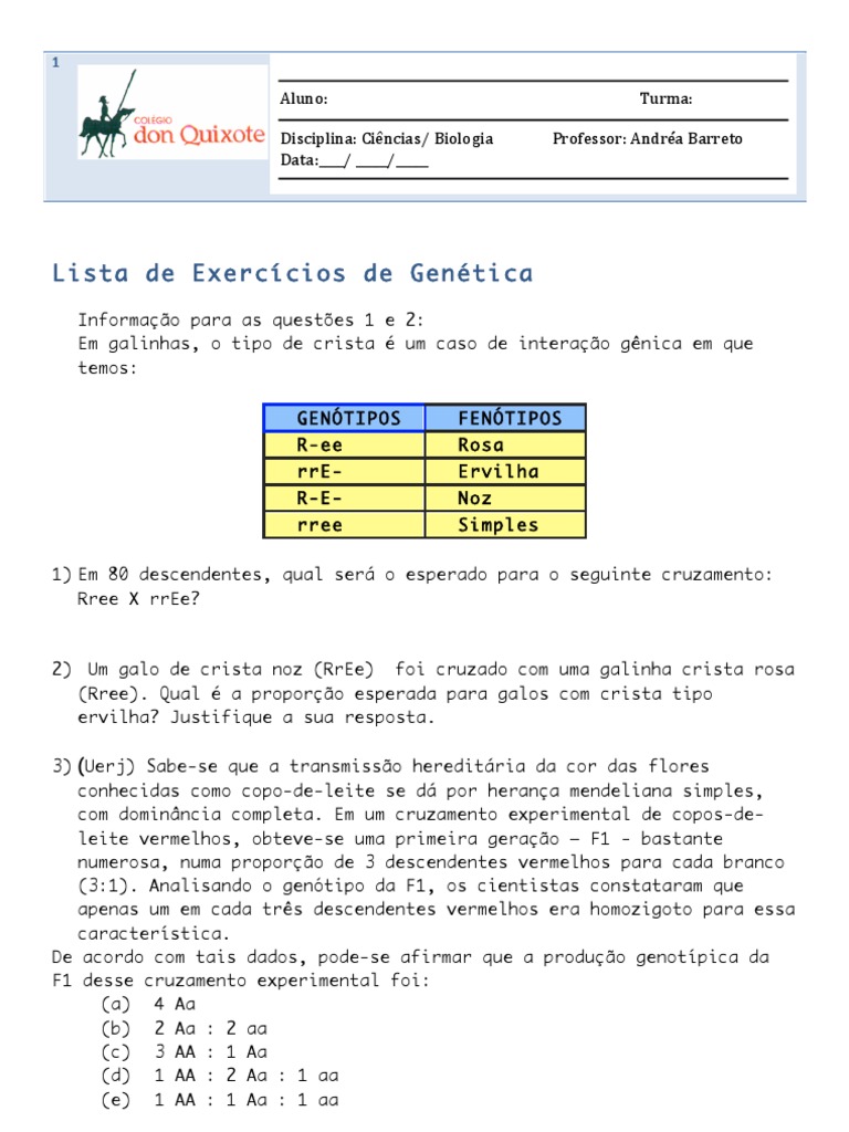 2) Um galo de crista noz (RrEe) foi cruzado com uma galinha crista rosa (Rree). Qual a proporo esperada para galos com crista tipo ervilha? Justifique a sua resposta. 3) (Uerj) Sabe-se que a transmisso hereditria da cor das flores conhecidas como copo-de-leite se d por herana mendeliana simples, com dominncia completa. Em um cruzamento experimental de copos-deleite vermelhos, obteve-se uma primeira gerao F1 - bastante numerosa, numa proporo de 3 descendentes vermelhos para cada branco (3:1). Analisando o gentipo da F1, os cientistas constataram que apenas um em cada trs descendentes vermelhos era homozigoto para essa caracterstica. De acordo com tais dados, pode-se afirmar que a produo genotpica da F1 desse cruzamento experimental foi: (a) 4 Aa (b) 2 Aa : 2 aa (c) 3 AA : 1 Aa (d) 1 AA : 2 Aa : 1 aa (e) 1 AA : 1 Aa : 1 aa