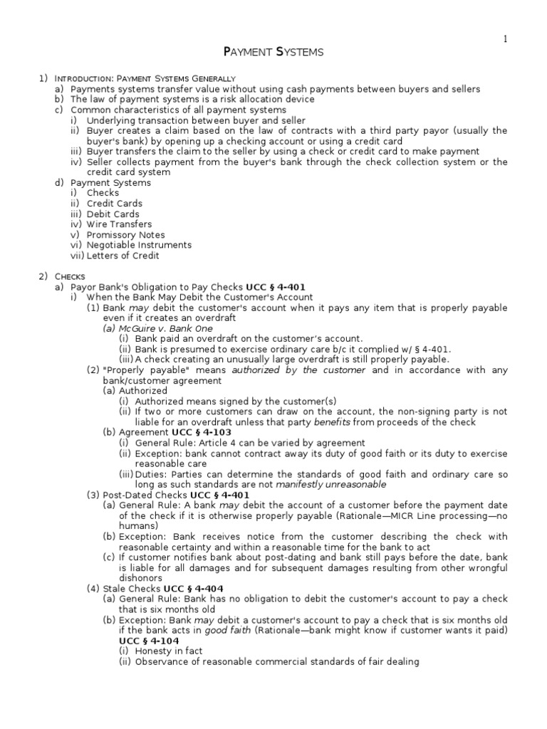 1) INTRODUCTION: PAYMENT SYSTEMS GENERALLY a) Payments systems transfer value without using cash payments between buyers and sellers b) The law of payment systems is a risk allocation device c) Common characteristics of all payment systems i) Underlying transaction between buyer and seller ii) Buyer creates a claim based on the law of contracts with a third party payor (usually the buyer's bank) by opening up a checking account or using a credit card iii) Buyer transfers the claim to the seller by using a check or credit card to make payment iv) Seller collects payment from the buyer's bank through the check collection system or the credit card system d) Payment Systems i) Checks ii) Credit Cards iii) Debit Cards iv) Wire Transfers v) Promissory Notes vi) Negotiable Instruments vii) Letters of Credit 2) CHECKS a) Payor Bank's Obligation to Pay Checks UCC 4-401 i) When the Bank May Debit the Customer's Account (1) Bank may debit the customer's account when it pays any item that is properly payable even if it creates an overdraft (a) McGuire v. Bank One (i) Bank paid an overdraft on the customers account. (ii) Bank is presumed to exercise ordinary care b/c it complied w/ 4-401. (iii) A check creating an unusually large overdraft is still properly payable. (2) "Properly payable" means authorized by the customer and in accordance with any bank/customer agreement (a) Authorized (i) Authorized means signed by the customer(s) (ii) If two or more customers can draw on the account, the non-signing party is not liable for an overdraft unless that party benefits from proceeds of the check (b) Agreement UCC 4-103 (i) General Rule: Article 4 can be varied by agreement (ii) Exception: bank cannot contract away its duty of good faith or its duty to exercise reasonable care (iii) Duties: Parties can determine the standards of good faith and ordinary care so long as such standards are not manifestly unreasonable (3) Post-Dated Checks UCC 4-401 (a) General Rule: A bank may debit the account of a customer before the payment date of the check if it is otherwise properly payable (RationaleMICR Line processingno humans) (b) Exception: Bank receives notice from the customer describing the check with reasonable certainty and within a reasonable time for the bank to act (c) If customer notifies bank about post-dating and bank still pays before the date, bank is liable for all damages and for subsequent damages resulting from other wrongful dishonors (4) Stale Checks UCC 4-404 (a) General Rule: Bank has no obligation to debit the customer's account to pay a check that is six months old (b) Exception: Bank may debit a customer's account to pay a check that is six months old if the bank acts in good faith (Rationalebank might know if customer wants it paid) UCC 4-104 (i) Honesty in fact (ii) Observance of reasonable commercial standards of fair dealing