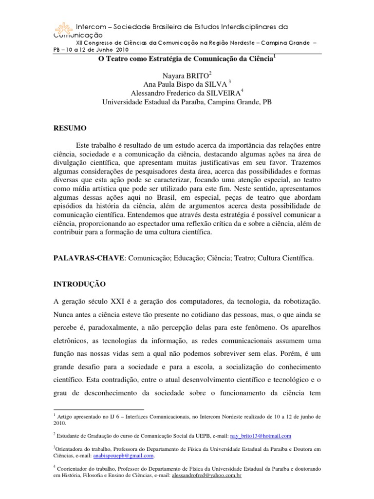 O Teatro como Estratgia de Comunicao da Cincia1 Nayara BRITO2 Ana Paula Bispo da SILVA 3 Alessandro Frederico da SILVEIRA4 Universidade Estadual da Paraba, Campina Grande, PB