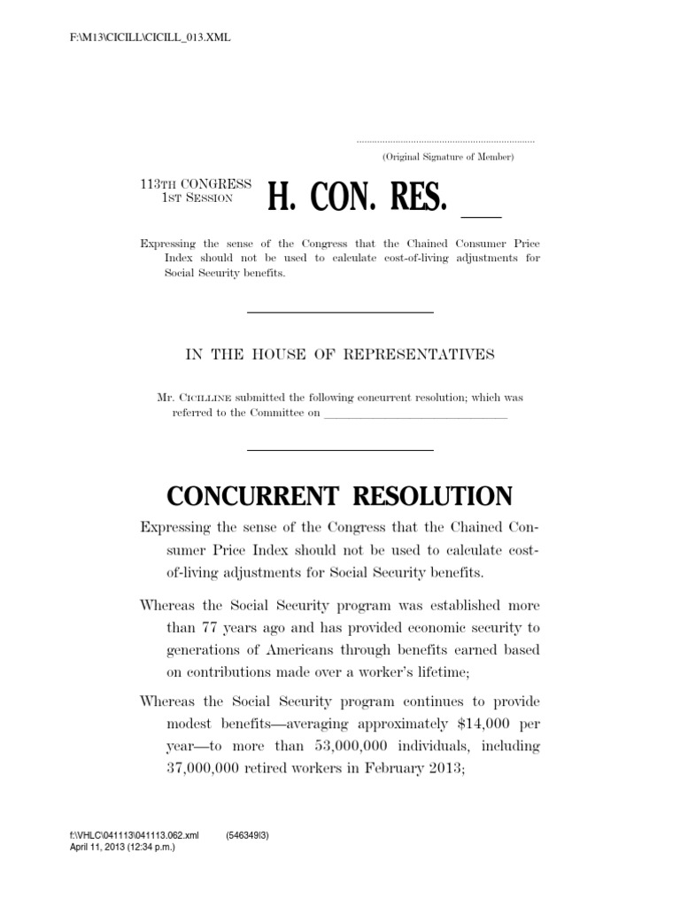 2 Whereas the Social Security program has no borrowing au-thority, has accumulated assets of $2,700,000,000,000,and, therefore, does not contribute to the Federal budgetdeficit; Whereas the Board of Trustees of the Federal Old-Age andSurvivors Insurance Trust Fund projects that such TrustFund can pay full benefits through 2032; Whereas the Social Security program is designed to ensurethat benefits keep pace with inflation through cost-of-liv-ing adjustments (COLAs) that are based upon the meas- ured changes in prices of goods and services purchased by consumers, currently the Consumer Price Index forUrban Wage Earners and Clerical Workers (CPI–W)published by the Bureau of Labor Statistics; Whereas the Bureau of Labor Statistics publishes a supple-mental measure of inflation, the Chained Consumer PriceIndex for all Urban Consumers (C–CPI–U), or ‘‘ChainedCPI’’, which adjusts for projected changes in consumer behavior resulting from price fluctuations known as the‘‘substitution effect’’, which occurs when consumers buy more goods and services whose prices are rising slowerthan average and less of those rising faster than average; Whereas studies indicate typical Social Security beneficiariesspend significantly greater shares of their budget thanconsumers generally on health care, prices for which haveincreased at higher than average rates, and health caremay not be easily substituted for by consumers such asseniors; Whereas the Congressional Budget Office has estimated that using the Chained CPI to calculate Social Security COLAs would reduce Social Security benefits by 0.25