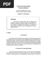 constantly changing life-styles, cities, towns, roads, buildings, industries and farmlands have been constructed thereby altering the natural landscape. THE BUSINESS OF LANDSCAPE DESIGNING The study of landscaping as a profession began many years ago in Europe and America. Unfortunately, institution of higher learning in Nigeria are yet to offer courses in landscape architecture. However, landscaping has been practiced in this country as a hobby and as a career for many years now. HORTICULTURE Horticulture is the cultivation of garden crops. Garden crop traditionally include edible fruits, vegetables, ornamental plants as well as medicinal, the cultivation of which bring monetary rewards or personal pleasure. According to the kind of products and uses to which they are put, horticulture is sub-divided into: (a) Pomology: The cultivation of edible fruits such as apples, guava, oranges, paw-paw, coconuts, mango. (b) Olericultur: The cultivation of vegetables such as tomatoes, okro, waterleaves and other greens, peppers, pumpkin, garden eggs, beans, carrots. (c) Floriculture: Deals with the production of followers, potted plants and other ornamental plants. (d) Landscape horticulture: deals with the cultivation of plants for the landscape such as shrubs, trees, vines and turf grass. PRINCIPLES OF LANDSCAPE DESIGN Landscape design is a form of applied art. It combines creativity with imagination. All forms of art are guided by basic principles. The following principles are applied in landscape designing: (1) simplicity (2) balance (3) proportion (4) focalization (5) rhythmn and line.
