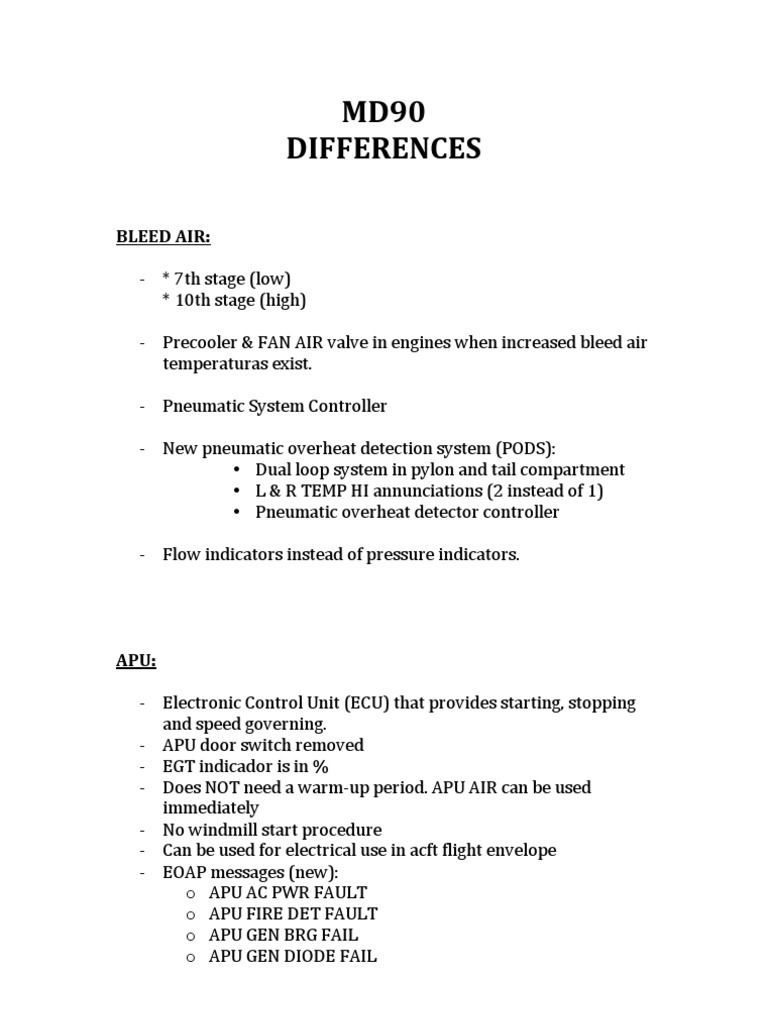 AIRCRAFTGENERAL: EMERPWR: EmerLight,CockpitFloodLights,StbyCabinLightsremain illuminateduntilEMERPWRswitchmovedtoON. EmerLightsOFF,CkptFloodLight+CabinStbyLights illuminated ELECTRICALSYSTEM: 2VSCF/BATT/EPCU APUdrivengenerador CSDsreplacedby2CONVERTERUNITS,cooledbyafan (poweredbyrespectiveConverterUnit) 115V/400Hz(1153;4004) Bothinstalledonanunpressurizedcompartment BATT:3x9,3Vbatteries28VDCpwr60minincludingfirst APUstart.(foreachadditionalAPUstart5min) BATDIRBUSFEEDC/BmechanicalactuadorreplacedbyRCCB (inE&Ecompartment) EPCU(ElecPwrCtrlUnit):ProvidesprotectionforEXTPWR, TIEBUS&[Link].(GalleyPwr automaticallyOFFTuringsingleGENoperation) WhenEMERPWRARM+BATTON+1FUELSWON EMERPWRwillsupplyBATTPWRtotheEMERACBUS, EMERDCBUS&DCXFERBUSifnormalPWRislost. CrewmustrotateEMERPWRtoON. BymovingswitchtoOFF,thenARMwillresetthesystem. NOTE:EMERPWRswitchisINOPwhenBATTswisOFF InMD90,NoBreakPowerTransferSystemincorporatedin [Link] transfers(bymomentaryparalleling)