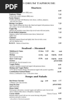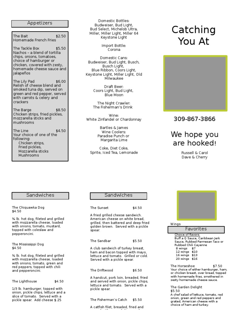 The Bait $2.50 Homemade French Fries The Tackle Box $5.50 Nachos a blend of tortilla chips, onions, tomatoes, choice of hamburger or chicken, covered with zesty, homemade cheese sauce and jalapeos The Lily Pad $6.00 Relish of cheese blend and smoked tuna dip, served on green and red pepper, served with carrots & celery and crackers The Barge $8.50 Chicken strips, fried pickles, mozzarella sticks and mushrooms The Line $4.50 Your choice of one of the following: Chicken strips, Fried pickles, Mozzarella sticks Mushrooms