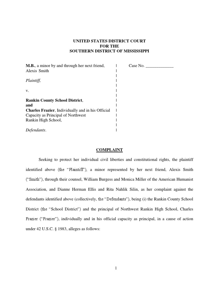 M.B., a minor, is the Plaintiff in this case, and pleads by and through her next friend, Alexis Smith. M.B. is a sixteen-year-old eleventh grader in her junior year at the School. She lives in Brandon, Mississippi. 6.