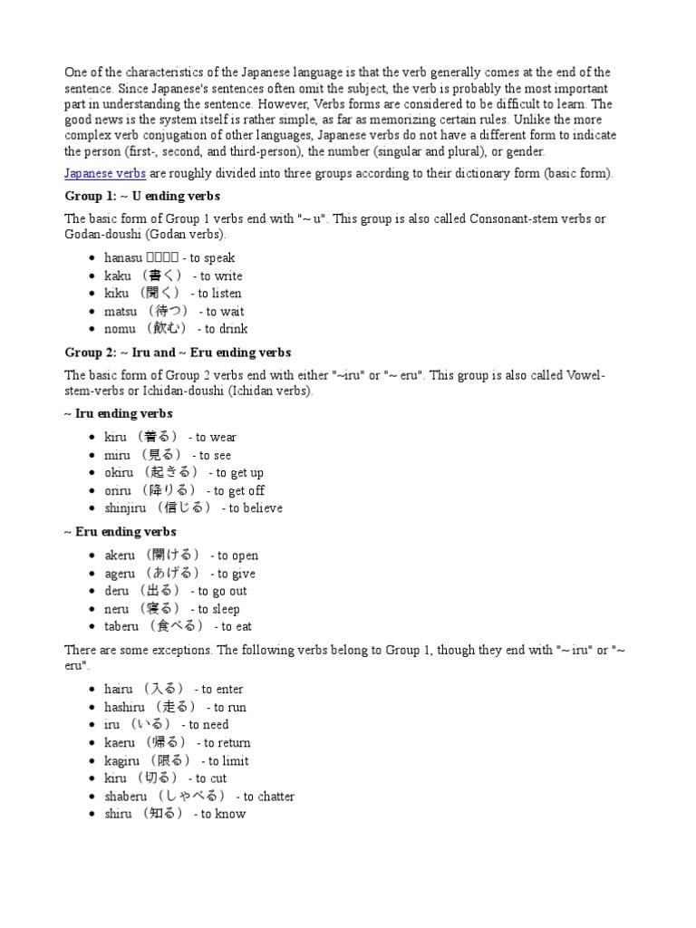 Since Japanese's sentences often omit the subject, the verb is probably the most important part in understanding the sentence. However, Verbs forms are considered to be difficult to learn. The good news is the system itself is rather simple, as far as memorizing certain rules. Unlike the more complex verb conjugation of other languages, Japanese verbs do not have a different form to indicate the person (first-, second, and third-person), the number (singular and plural), or gender. Japanese verbs are roughly divided into three groups according to their dictionary form (basic form). Group 1: ~ U ending verbs The basic form of Group 1 verbs end with "~ u". This group is also called Consonant-stem verbs or Godan-doushi (Godan verbs). hanasu - to speak kaku - to write kiku - to listen matsu - to wait nomu - to drink