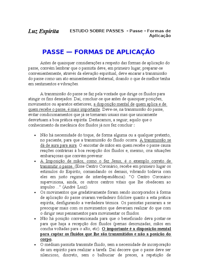 No h necessidade do toque, de forma alguma ou a qualquer pretexto, no paciente, para que a transmisso do fluido ocorra. A transmisso se d de aura para aura. O encostar de mos em quem recebe o passe causa reaes contrrias boa recepo dos fluidos e, mesmo, cria situaes embaraosas que convm prevenir. A Imposio de mos, como o fez Jesus, o exemplo correto de transmitir o passe. (Esse Centro Coronrio, recebe em primeiro lugar os estmulos do Esprito, comandando os demais, vibrando todavia com eles em justo regime de interdependncia). O Centro Coronrio supervisiona, ainda, os outros centros vitais que lhe obedecem ao impulso ... (Andr Luiz). Os movimentos que gradativamente foram sendo incorporados forma de aplicao do passe criaram verdadeiro folclore quanto a esta prtica esprita, desfigurando a verdadeira tcnica. Os passistas passaram a se preocupar mais com os movimentos que deveriam realizar do que com o dirigir seus pensamentos para movimentar os fluidos. No h posio convencionada para que o beneficiado deva postar-se para que haja a recepo dos fluidos (pernas descruzadas, mos em concha voltadas para o alto, etc). O importante a disposio mental para captar os fluidos que lhe so transmitidos e no a posio do corpo. O mdium passista transmite fluido, sem a necessidade de incorporao de um esprito para realizar a tarefa. Da decorre que o passe deve ser silencioso, discreto, sem o balbuciar de preces, a repetio de