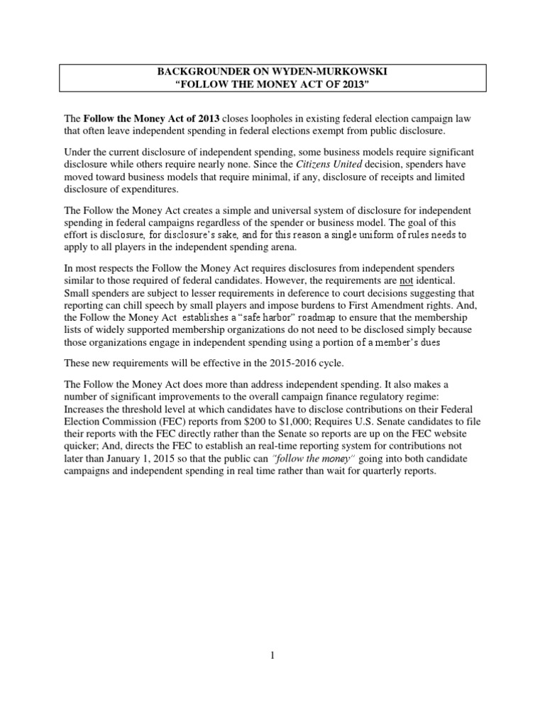 in existing federal election campaign law that often leave independent spending in federal elections exempt from public disclosure. Under the current disclosure of independent spending, some business models require significant disclosure while others require nearly none. Since the Citizens United decision, spenders have moved toward business models that require minimal, if any, disclosure of receipts and limited disclosure of expenditures. The Follow the Money Act creates a simple and universal system of disclosure for independent spending in federal campaigns regardless of the spender or business model. The goal of this effort is disclosure, for disclosures sake, and for this reason a single uniform of rules needs to apply to all players in the independent spending arena. In most respects the Follow the Money Act requires disclosures from independent spenders similar to those required of federal candidates. However, the requirements are not identical. Small spenders are subject to lesser requirements in deference to court decisions suggesting that reporting can chill speech by small players and impose burdens to First Amendment rights. And, the Follow the Money Act establishes a safe harbor roadmap to ensure that the membership lists of widely supported membership organizations do not need to be disclosed simply because those organizations engage in independent spending using a portion of a members dues These new requirements will be effective in the 2015-2016 cycle. The Follow the Money Act does more than address independent spending. It also makes a number of significant improvements to the overall campaign finance regulatory regime: Increases the threshold level at which candidates have to disclose contributions on their Federal Election Commission (FEC) reports from $200 to $1,000; Requires U.S. Senate candidates to file their reports with the FEC directly rather than the Senate so reports are up on the FEC website quicker; And, directs the FEC to establish an real-time reporting system for contributions not later than January 1, 2015 so that the public can follow the money going into both candidate campaigns and independent spending in real time rather than wait for quarterly reports.