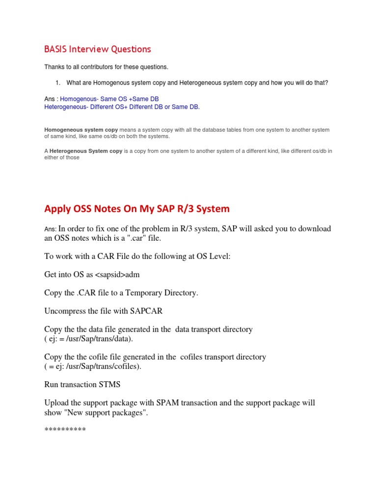 Thanks to all contributors for these questions. 1. What are Homogenous system copy and Heterogeneous system copy and how you will do that? Ans : Homogenous- Same OS +Same DB Heterogeneous- Different OS+ Different DB or Same DB.