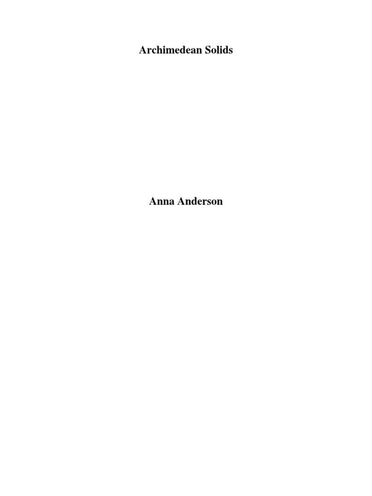 4 Archimedes was born at the end of Euclids life in Syracuse, Sicily. He is known for the legendary cry of Eureka when introducing the theory of buoyancy, and for calculating the first accurate estimation of pi. He had many great mathematical discoveries, but his Archimedean solids are perhaps the primary contributors to his lasting fame. Archimedean solids, like Platonic solids, must be convex figures, but they are not exactly the same as Platonic solids. Archimedean Solids are the convex polyhedra that have a similar arrangement of nonintersecting regular convex polygons of two or more different types arranged in the same way about each vertex with all the edges the same length (Cromwell, 1997). The Platonic Solids are convex figures made up of one type of regular polygon. Archimedean solids are convex figures that can be made up of two or more types of regular polygons. All edge lengths of the polygons must be equal, and all of the vertices must be identical, meaning the polygons that meet at each vertex do so in the same way. Unlike prisms, which may have an arrangement of regular polygons at each vertex, Archimedean solids require that at all vertices the angles must be the same. The first five Archimedean solids are created by truncating the original Platonic solids. This allows more than one kind of regular polygon to be used for the faces. The truncated cube is created by taking a cube (which is a Platonic solid) and literally cutting off the corners to create eight equilateral triangles. The truncated cube is shown below and has one triangle and two octagons around each vertex. It is then notated as (3,8,8) for the one triangle and two octagons at each vertex. Another notation is the Cundy and Rollett symbol which denotes the vertex in almost the same way, but uses exponents to avoid writing the same number multiple times. The Cundy and