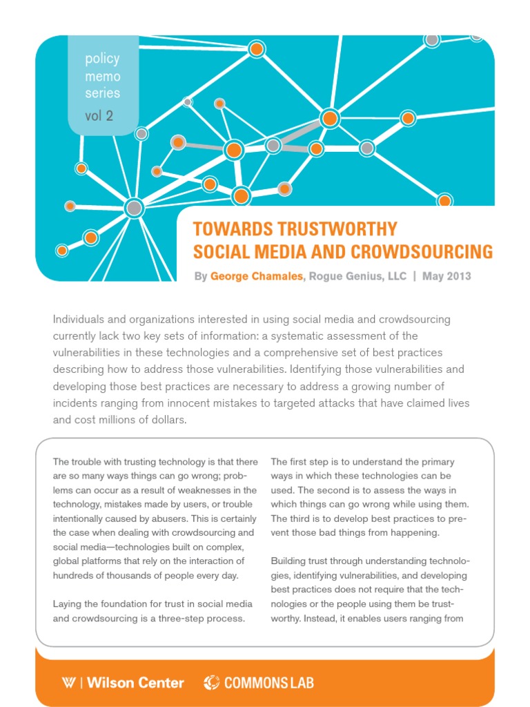 The trouble with trusting technology is that there are so many ways things can go wrong; prob-lems can occur as a result of weaknesses in the technology, mistakes made by users, or trouble intentionally caused by abusers. This is certainly the case when dealing with crowdsourcing and social media—technologies built on complex, global platforms that rely on the interaction of hundreds of thousands of people every day.Laying the foundation for trust in social media and crowdsourcing is a three-step process. The first step is to understand the primary ways in which these technologies can be used. The second is to assess the ways in which things can go wrong while using them. The third is to develop best practices to pre-vent those bad things from happening.Building trust through understanding technolo-gies, identifying vulnerabilities, and developing best practices does not require that the tech-nologies or the people using them be trust-worthy. Instead, it enables users ranging from