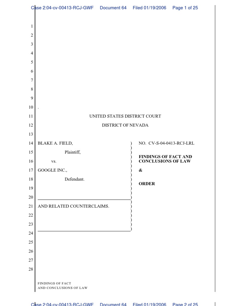 26 2. On May 25, 2004, Field filed an Amended Complaint, alleging that Google
