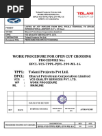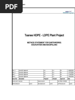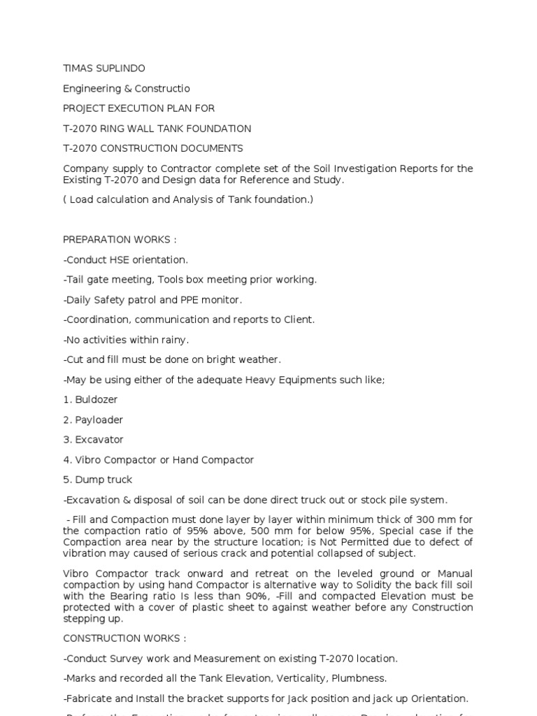 PREPARATION WORKS : -Conduct HSE orientation. -Tail gate meeting, Tools box meeting prior working. -Daily Safety patrol and PPE monitor. -Coordination, communication and reports to Client. -No activities within rainy. -Cut and fill must be done on bright weather. -May be using either of the adequate Heavy Equipments such like; 1. Buldozer 2. Payloader 3. Excavator 4. Vibro Compactor or Hand Compactor 5. Dump truck -Excavation & disposal of soil can be done direct truck out or stock pile system. - Fill and Compaction must done layer by layer within minimum thick of 300 mm for the compaction ratio of 95% above, 500 mm for below 95%, Special case if the Compaction area near by the structure location; is Not Permitted due to defect of vibration may caused of serious crack and potential collapsed of subject. Vibro Compactor track onward and retreat on the leveled ground or Manual compaction by using hand Compactor is alternative way to Solidity the back fill soil with the Bearing ratio Is less than 90%, -Fill and compacted Elevation must be protected with a cover of plastic sheet to against weather before any Construction stepping up. CONSTRUCTION WORKS : -Conduct Survey work and Measurement on existing T-2070 location. -Marks and recorded all the Tank Elevation, Verticality, Plumbness. -Fabricate and Install the bracket supports for Jack position and jack up Orientation. -Perform the Excavation works for outer ring wall as per Drawing, elevation for HDPE laying and non granular soil materials fill, compact to 95% ratio as per drawing elevation, and one layer of Sandy gravel as per drawing elevation, this is for the environment space as per Tank farm specification. -Refer to the results of Survey and data topography at T-2070, Performed the existing ground excavation outside of the ring wall area, replace the existing soil by means of strengthen the soil structure and improve the soil stabilities. -Mean while, set up temporary bracing and supports for existing Pontoon etc