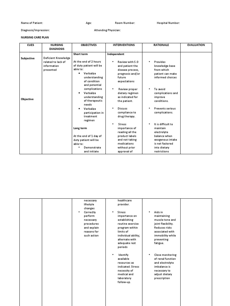 Name of Patient: Diagnosis/Impression: NURSING CARE PLAN CUES NURSING DIAGNOSIS Deficient Knowledge related to lack of information presented