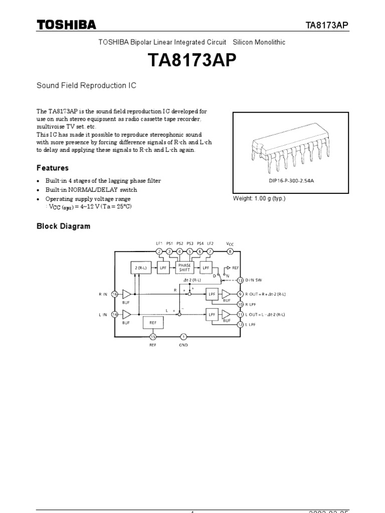 The TA8173AP is the sound field reproduction IC developed for use on such stereo equipment as radio cassette tape recorder, multivoise TV set. etc. This IC has made it possible to reproduce stereophonic sound with more presence by forcing difference signals of R-ch and L-ch to delay and applying these signals to R-ch and L-ch again.