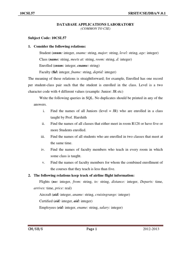 Subject Code: 10CSL57 1. Consider the following relations: Student (snum: integer, sname: string, major: string, level: string, age: integer) Class (name: string, meets at: string, room: string, d: integer) Enrolled (snum: integer, cname: string) Faculty (fid: integer, fname: string, deptid: integer) The meaning of these relations is straightforward; for example, Enrolled has one record per student-class pair such that the student is enrolled in the class. Level is a two character code with 4 different values (example: Junior: JR etc) Write the following queries in SQL. No duplicates should be printed in any of the answers. i. Find the names of all Juniors (level = JR) who are enrolled in a class taught by Prof. Harshith ii. Find the names of all classes that either meet in room R128 or have five or more Students enrolled. iii. Find the names of all students who are enrolled in two classes that meet at the same time. iv. Find the names of faculty members who teach in every room in which some class is taught. v. Find the names of faculty members for whom the combined enrollment of the courses that they teach is less than five. 2. The following relations keep track of airline flight information: Flights (no: integer, from: string, to: string, distance: integer, Departs: time, arrives: time, price: real) Aircraft (aid: integer, aname: string, cruisingrange: integer) Certified (eid: integer, aid: integer) Employees (eid: integer, ename: string, salary: integer)