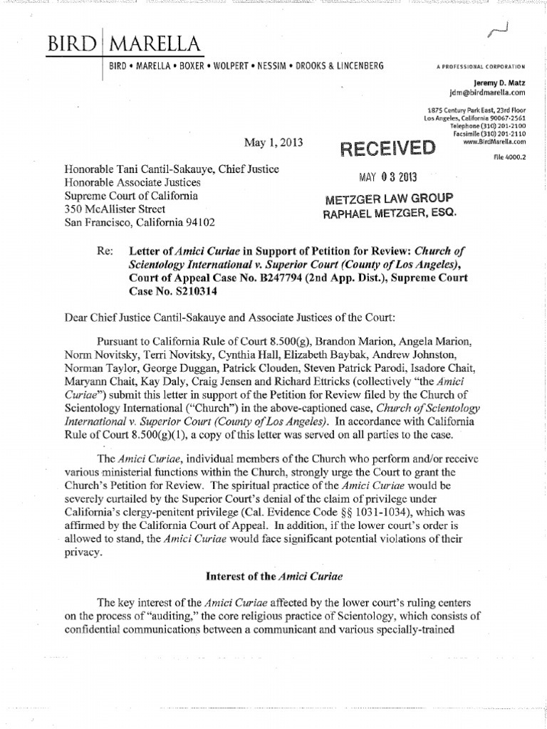 Friend of the court letter supporting Church of Scientology's petition to CA Supreme Court