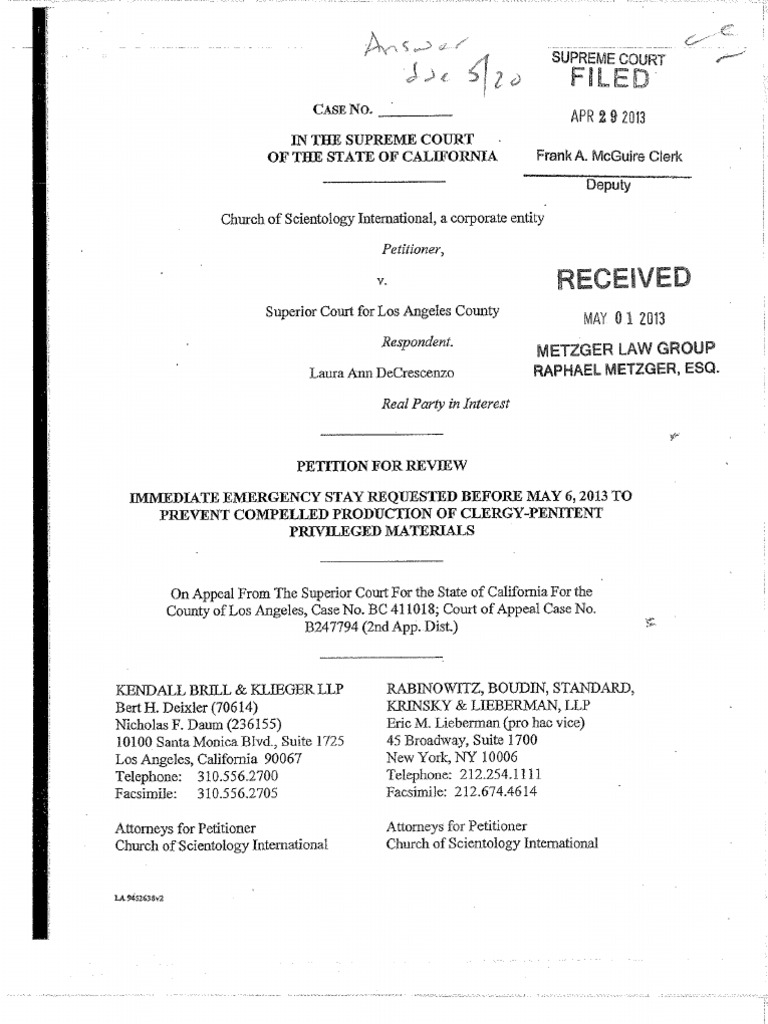 Church of Scientology petition to CA Supreme Court in Laura DeCrescenzo lawsuit