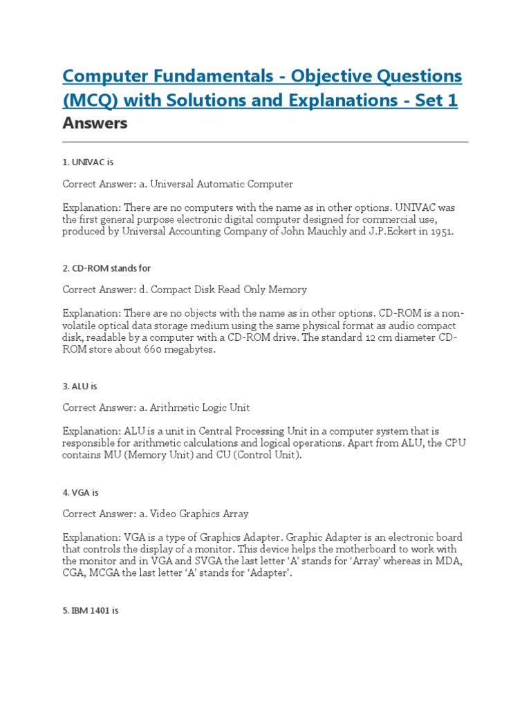 Computer Fundamentals - Objective Questions (MCQ) with Solutions and Explanations - Set 1