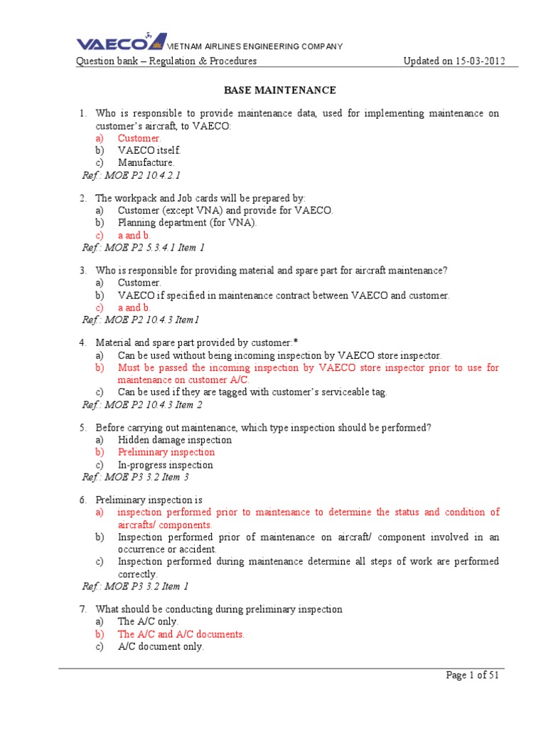 1. During the performance of maintenance tasks, CRS staff should a) check regularly working environment to ensure that NO foreign object exist on aircraft, engine and aircraft components. b) check on close-up of tasks to ensure that NO foreign object exist on aircraft, engine and aircraft components. c) not have to check for foreign object because Ground support staff is responsibility for removing all foreign objects Ref.: SOP 4.7 2. In line maintenance, before A/C arriving, assuring of NO foreign object available in parking area is responsibility of a) VAECO supporting staffs. b) CRS staff. c) Airport cleaning staffs. Ref.: SOP 4.1.4(4) 3. Required Inspection Item (RII) tasks required by Customer a) are performed, independently inspected and signed off by a inspection personnel. b) are performed by qualified mechanic, then independently inspected and signed off by a suitable CRS staff. c) are performed by qualified mechanic, then independently inspected and signed off by a inspection personnel staff who is accepted by customer. Ref.: SOP 10.7.4&10.7.5 4. When remove component, the tube end/ socket on A/C must be covered by a) Blanking cap/ plug b) Adhesive tape c) Plastic bag d) Plastic bag and adhesive tape Ref.: SOP 12.14.5(4)(a) 5. The A/C deferred defect should be deferred IAW . a) Customer procedures. b) VAECO procedures. c) Vietnam Airlines procedures. Ref.: SOP 6.3.4.14 6. According to VAECO procedure, A/C can be towed a) With Cargo Doors closed and locked. b) With Cargo Doors opened and locked at open position IAW. AMM task c) With NO specific requirement concerned to the A/C door position in towing. Ref.: SOP 6.1.5.4 7. How many staffs are required when towing A/C through crowded parking area? a) No one, because towbarless tractor driver is responsible for towing. b) 02 maintenance staffs Page 7 of 51