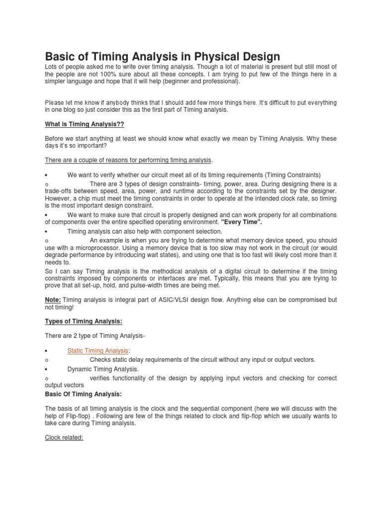 Dynamic Timing Analysis. o verifies functionality of the design by applying input vectors and checking for correct output vectors Basic Of Timing Analysis: The basis of all timing analysis is the clock and the sequential component (here we will discuss with the help of Flip-flop) . Following are few of the things related to clock and flip-flop which we usually wants to take care during Timing analysis. Clock related: