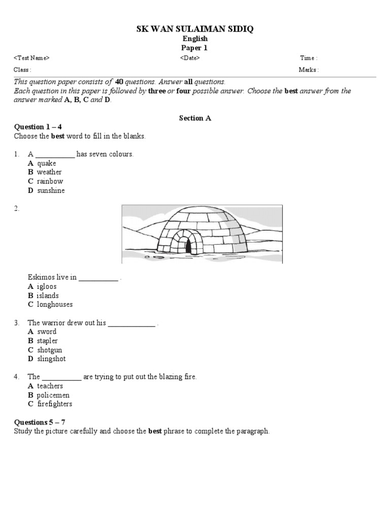 This question paper consists of 40 questions. Answer all questions. Each question in this paper is followed by three or four possible answer. Choose the best answer from the answer marked A, B, C and D. Section A Question 1 4 Choose the best word to fill in the blanks. 1. A __________ has seven colours. A quake B weather C rainbow D sunshine