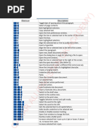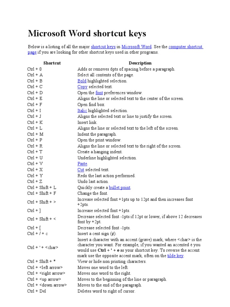 Below is a listing of all the major shortcut keys in Microsoft Word. See the computer shortcut page if you are looking for other shortcut keys used in other programs. Shortcut Ctrl + 0 Ctrl + A Ctrl + B Ctrl + C Ctrl + D Ctrl + E Ctrl + F Ctrl + I Ctrl + J Ctrl + K Ctrl + L Ctrl + M Ctrl + P Ctrl + R Ctrl + T Ctrl + U Ctrl + V Ctrl + X Ctrl + Y Ctrl + Z Ctrl + Shift + L Ctrl + Shift + F Ctrl + Shift + > Ctrl + ] Ctrl + Shift + < Ctrl + [ Ctrl + / + c Ctrl + ' + <char> Ctrl + Shift + * Ctrl + <left arrow> Ctrl + <right arrow> Ctrl + <up arrow> Ctrl + <down arrow> Ctrl + Del Description Adds or removes 6pts of spacing before a paragraph. Select all contents of the page. Bold highlighted selection. Copy selected text. Open the font preferences window. Aligns the line or selected text to the center of the screen. Open find box. Italic highlighted selection. Aligns the selected text or line to justify the screen. Insert link. Aligns the line or selected text to the left of the screen. Indent the paragraph. Open the print window. Aligns the line or selected text to the right of the screen. Create a hanging indent. Underline highlighted selection. Paste. Cut selected text. Redo the last action performed. Undo last action. Quickly create a bullet point. Change the font. Increase selected font +1pts up to 12pt and then increases font +2pts. Increase selected font +1pts. Decrease selected font -1pts if 12pt or lower, if above 12 decreases font by +2pt. Decrease selected font -1pts. Insert a cent sign (). Insert a character with an accent (grave) mark, where <char> is the character you want. For example, if you wanted an accented you would use Ctrl + ' + e as your shortcut key. To reverse the accent mark use the opposite accent mark, often on the tilde key. View or hide non printing characters. Moves one word to the left. Moves one word to the right. Moves to the beginning of the line or paragraph. Moves to the end of the paragraph. Deletes word to right of cursor.