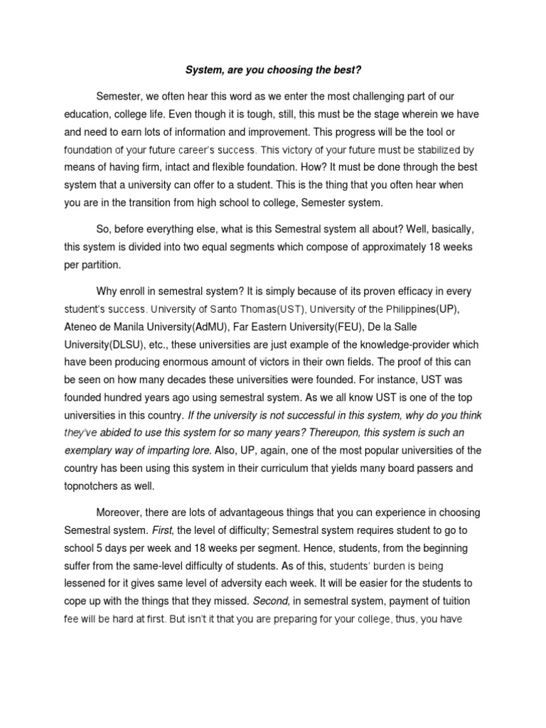 Semester, we often hear this word as we enter the most challenging part of our education, college life. Even though it is tough, still, this must be the stage wherein we have and need to earn lots of information and improvement. This progress will be the tool or foundation of your future careers success. This victory of your future must be stabilized by means of having firm, intact and flexible foundation. How? It must be done through the best system that a university can offer to a student. This is the thing that you often hear when you are in the transition from high school to college, Semester system. So, before everything else, what is this Semestral system all about? Well, basically, this system is divided into two equal segments which compose of approximately 18 weeks per partition. Why enroll in semestral system? It is simply because of its proven efficacy in every students success. University of Santo Thomas(UST), University of the Philippines(UP), Ateneo de Manila University(AdMU), Far Eastern University(FEU), De la Salle University(DLSU), etc., these universities are just example of the knowledge-provider which have been producing enormous amount of victors in their own fields. The proof of this can be seen on how many decades these universities were founded. For instance, UST was founded hundred years ago using semestral system. As we all know UST is one of the top universities in this country. If the university is not successful in this system, why do you think theyve abided to use this system for so many years? Thereupon, this system is such an exemplary way of imparting lore. Also, UP, again, one of the most popular universities of the country has been using this system in their curriculum that yields many board passers and topnotchers as well. Moreover, there are lots of advantageous things that you can experience in choosing Semestral system. First, the level of difficulty; Semestral system requires student to go to school 5 days per week and 18 weeks per segment. Hence, students, from the beginning suffer from the same-level difficulty of students. As of this, students burden is being lessened for it gives same level of adversity each week. It will be easier for the students to cope up with the things that they missed. Second, in semestral system, payment of tuition fee will be hard at first. But isnt it that you are preparing for your college, thus, you have