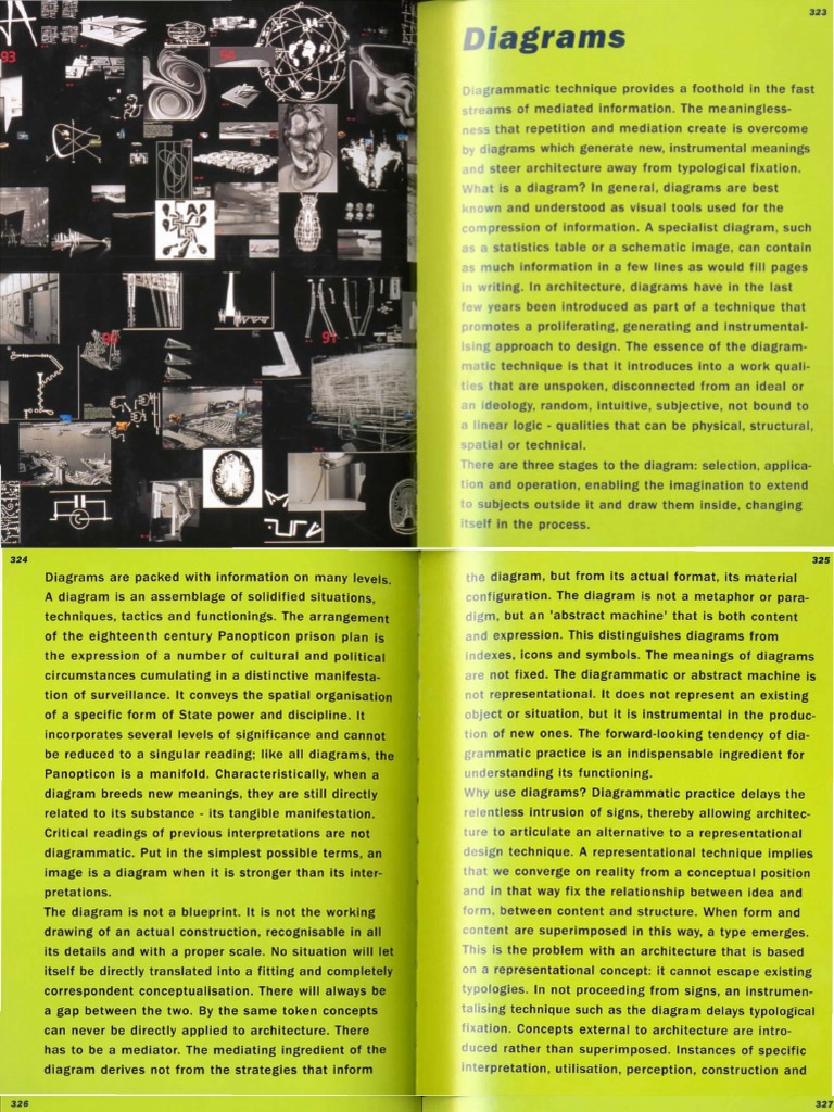 he diagram, but from its actual format, its material configuration. The diagram is not a metaphor or paraigm, but an 'abstract machine' that is both content "nd expression. This distinguishes diagrams from indexes, icons and symbols. The meanings of diagrams are not fixed. The diagrammatic or abstract machine is ot representational. It does not represent an existing object or situation, but it is Instrumental in the product,on of new ones. The forward-looking tendency of diagrammatic practice is an indispensable ingredient for understanding its functioning. Why use diagrams? Diagrammatic practice delays the relentless intrusion of signs, thereby allowing architecture to articulate an alternative to a representational design technique. A representational technique implies that we converge on reality from a conceptual position and In that way fix the relationship between idea and form, between content and structure. When form and content are superimposed in this way, a type emerges. This is the problem with an architecture that is based on a representational concept: it cannot escape existing typologies. In not proceeding from signs, an instrumentalising technique such as the diagram delays typological fixation. Concepts external to architecture are introduced rather than superimposed. Instances of specific interpretation, utilisation, perception, construction and