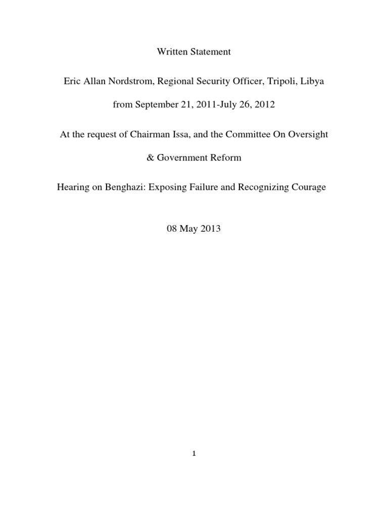 Opening Statement of Eric Nordstrom at May 8 House Oversight and Government Reform Committee Hearing On Benghazi Attacks