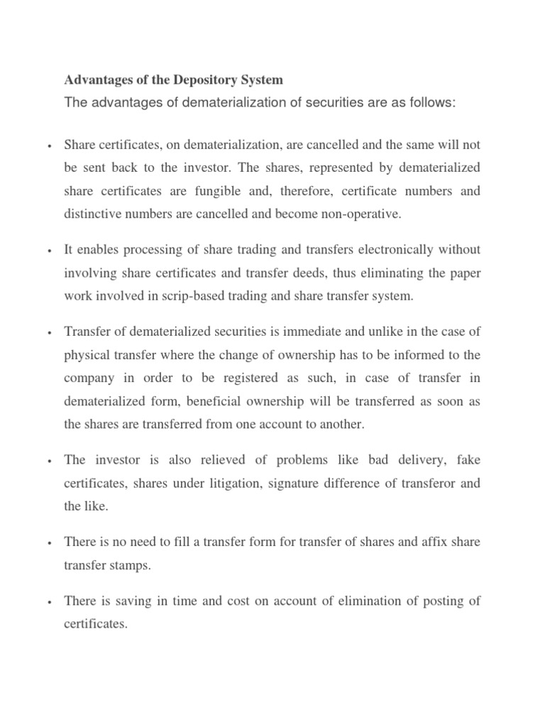 Advantages of the Depository System The advantages of dematerialization of securities are as follows: