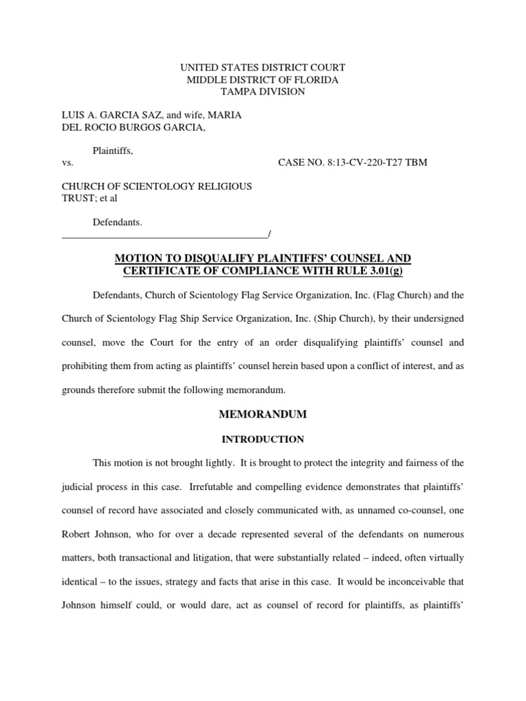 UNITED STATES DISTRICT COURT MIDDLE DISTRICT OF FLORIDA TAMPA DIVISION LUIS A. GARCIA SAZ, and wife, MARIA DEL ROCIO BURGOS GARCIA, Plaintiffs, vs. CASE NO. 8:13-CV-220-T27 TBM CHURCH OF SCIENTOLOGY RELIGIOUS TRUST; et al Defendants. ________________________________________/
