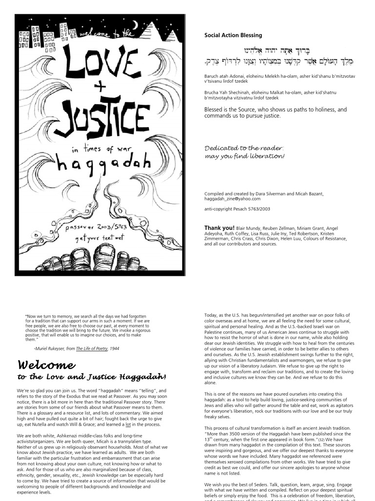 The Love and Justice in times of war HAGGADAH ZINE is your source for creating a choose-your-own-adventure progressive seder. This haggadah is fully accessible for folks who have never organized a seder, or are new to celebrating Passover: it includes transliterations, translations, a glossary, a resource list, and stories from some of our friends about what