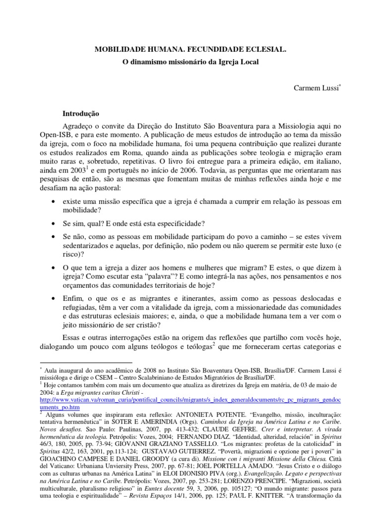 O dinamismo missionário da Igreja Local Carmem Lussi∗ Introdução Agradeço o convite da Direção do Instituto São Boaventura para a Missiologia aqui no Open-ISB, e para este momento. A publicação de meus estudos de introdução ao tema da missão da igreja, com o foco na mobilidade humana, foi uma pequena contribuição que realizei durante os estudos realizados em Roma, quando ainda as publicações sobre teologia e migração eram muito raras e, sobretudo, repetitivas. O livro foi entregue para a primeira edição, em italiano, ainda em 20031 e em português no início de 2006. Todavia, as perguntas que me orientaram nas pesquisas de então, são as mesmas que fomentam muitas de minhas reflexões ainda hoje e me desafiam na ação pastoral: • • • existe uma missão específica que a igreja é chamada a cumprir em relação às pessoas em mobilidade? Se sim, qual? E onde está esta especificidade? Se não, como as pessoas em mobilidade participam do povo a caminho – se estes vivem sedentarizados e aquelas, por definição, não podem ou não querem se permitir este luxo (e risco)? O que tem a igreja a dizer aos homens e mulheres que migram? E estes, o que dizem à igreja? Como escutar esta “palavra”? E como integrá-la nas ações, nos pensamentos e nos orçamentos das comunidades territoriais de hoje? Enfim, o que os e as migrantes e itinerantes, assim como as pessoas deslocadas e refugiadas, têm a ver com a vitalidade da igreja, com a missionariedade das comunidades e das estruturas eclesiais maiores; e, ainda, o que a mobilidade humana tem a ver com o jeito missionário de ser cristão?
