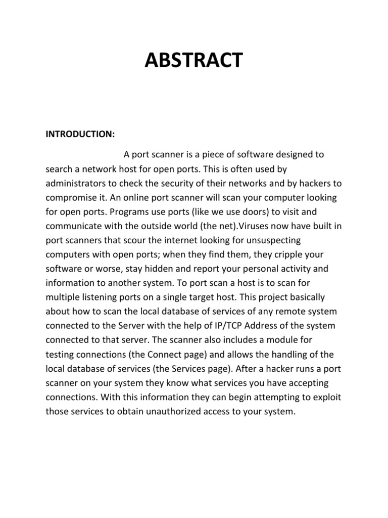 INTRODUCTION: A port scanner is a piece of software designed to search a network host for open ports. This is often used by administrators to check the security of their networks and by hackers to compromise it. An online port scanner will scan your computer looking for open ports. Programs use ports (like we use doors) to visit and communicate with the outside world (the net).Viruses now have built in port scanners that scour the internet looking for unsuspecting computers with open ports; when they find them, they cripple your software or worse, stay hidden and report your personal activity and information to another system. To port scan a host is to scan for multiple listening ports on a single target host. This project basically about how to scan the local database of services of any remote system connected to the Server with the help of IP/TCP Address of the system connected to that server. The scanner also includes a module for testing connections (the Connect page) and allows the handling of the local database of services (the Services page). After a hacker runs a port scanner on your system they know what services you have accepting connections. With this information they can begin attempting to exploit those services to obtain unauthorized access to your system.
