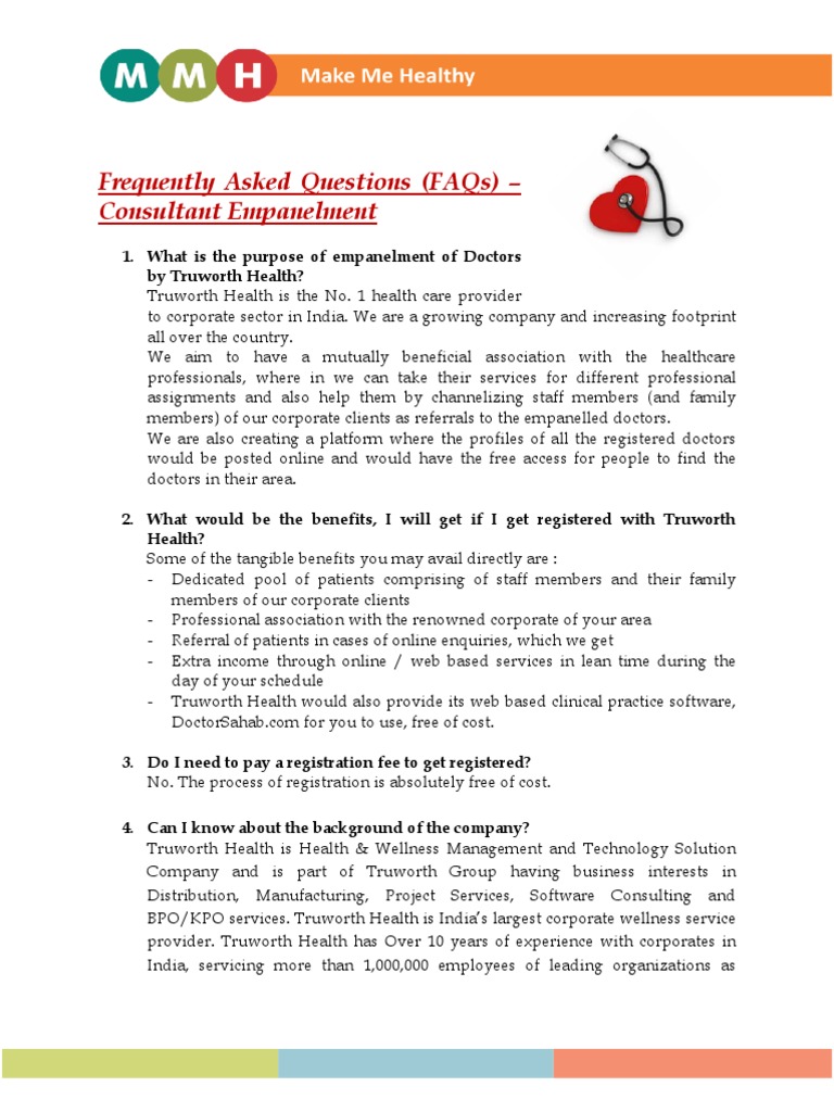 1. What is the purpose of empanelment of Doctors by Truworth Health? Truworth Health is the No. 1 health care provider to corporate sector in India. We are a growing company and increasing footprint all over the country. We aim to have a mutually beneficial association with the healthcare professionals, where in we can take their services for different professional assignments and also help them by channelizing staff members (and family members) of our corporate clients as referrals to the empanelled doctors. We are also creating a platform where the profiles of all the registered doctors would be posted online and would have the free access for people to find the doctors in their area. 2. What would be the benefits, I will get if I get registered with Truworth Health? Some of the tangible benefits you may avail directly are : - Dedicated pool of patients comprising of staff members and their family members of our corporate clients - Professional association with the renowned corporate of your area - Referral of patients in cases of online enquiries, which we get - Extra income through online / web based services in lean time during the day of your schedule - Truworth Health would also provide its web based clinical practice software, [Link] for you to use, free of cost. 3. Do I need to pay a registration fee to get registered? No. The process of registration is absolutely free of cost. 4. Can I know about the background of the company? Truworth Health is Health & Wellness Management and Technology Solution Company and is part of Truworth Group having business interests in Distribution, Manufacturing, Project Services, Software Consulting and BPO/KPO services. Truworth Health is Indias largest corporate wellness service provider. Truworth Health has Over 10 years of experience with corporates in India, servicing more than 1,000,000 employees of leading organizations as