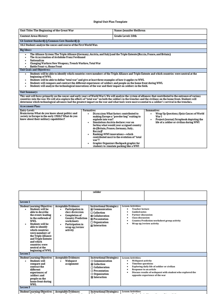 Unit Summary: This unit will focus primarily on the causes and early years of World War I. We will analyze the system of alliances that contributed to the entrance of various countries into the war. We will also explore the effects of total war on both the soldiers in the trenches and the civilians on the home front. Students will determine which technological advances had the greatest impact on the war and what tools were most essential to a soldiers s urvival in the trenches. Assessment Plan: Entry-Level: Brainstorm: What do you know about politics and society in Europe in the early 1900s? What do you know about their military capabilities? Formative: Discussion: What factors contributed to making Europe a powder keg waiting to explode into war? Simulation: Austria declares war on Serbia; what would your assigned country do (Britain, France, Germany, Italy, Russia)? Ranking: WWI innovationswhich contributed most to the evolution of total war? Graphic Organizer: Backpack graphic for students to simulate packing like a WWI Summative: Wrap Up Questions/Quiz: Causes of World War I Project: Journal/Scrapbook depicting the life of a soldier or civilian during WWI
