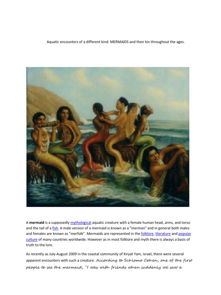 A mermaid is a supposedly mythological aquatic creature with a female human head, arms, and torso and the tail of a fish. A male version of a mermaid is known as a "merman" and in general both males and females are known as "merfolk". Mermaids are represented in the folklore, literature and popular culture of many countries worldwide. However as in most folklore and myth there is always a basis of truth to the lore. As recently as July-August 2009 in the coastal community of Kiryat Yam, Israel, there were several apparent encounters with such a creature. According to Schlomo Cohen, one of the first people to see the mermaid, I was with friends when suddenly we saw a